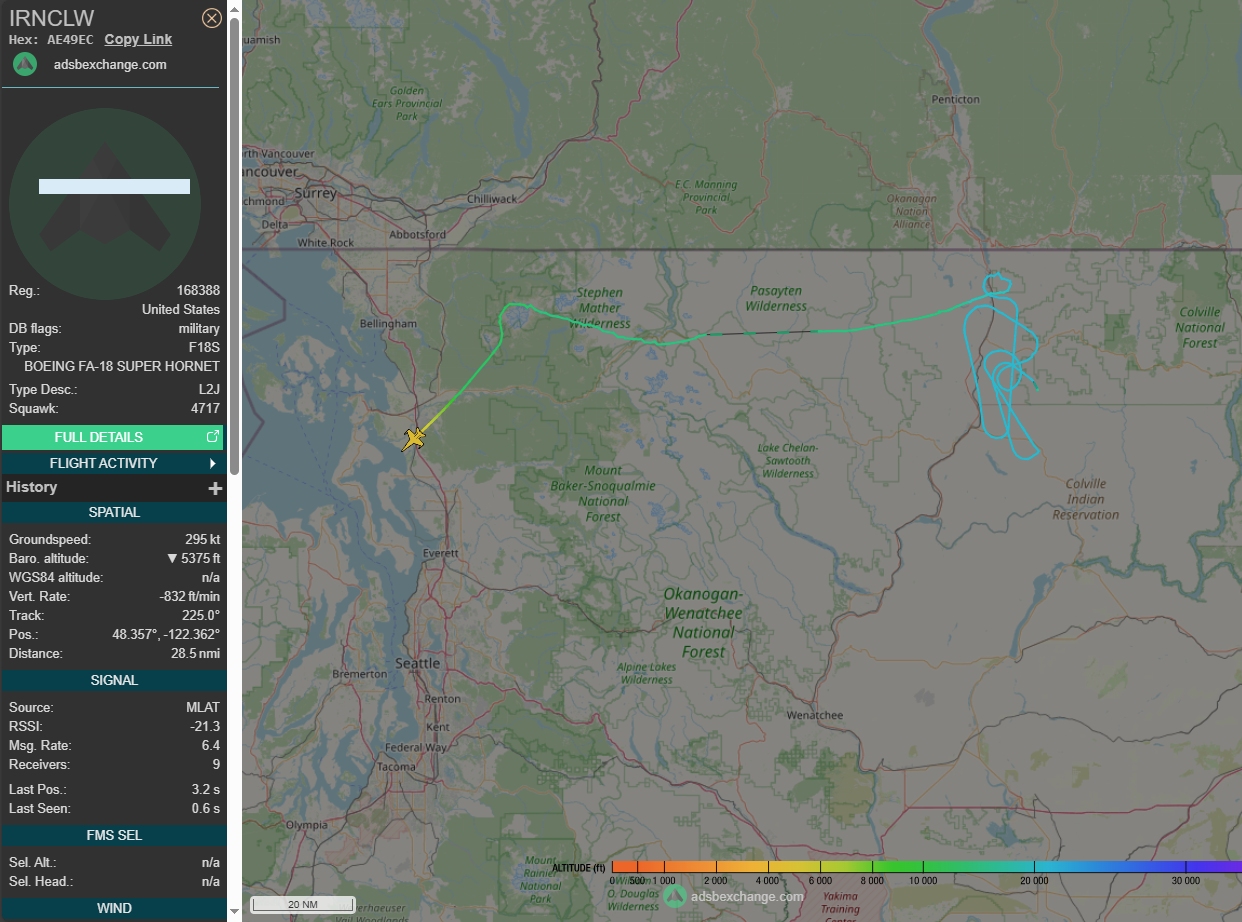 VAQ-134 EA-18G GARUDA51 appeared briefly on ADS-B when he asked Seattle Center on 270.3 for a transponder check. He went to the Darrington Operating Area for a functional check flight.