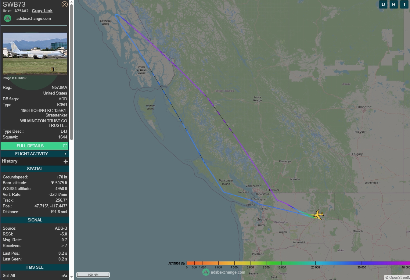 KC-135 SWIFTBIRD73 departed Fairchild AFB this morning, declared MARSA over Vancouver Island with VAQ-138 Growlers RAMPAGE 11 and 21 flights. Probably en route Red Flag Alaska. Boom freq 352.9.
